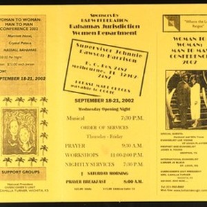 Flier for Woman to woman: man to man conference, Nassau, Bahamas, 2002 September 18-21. [Description English/roman)]