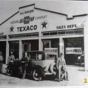 Photo--black and white: In August 1932 R. C. Myers sold his Sebastopol Chevrolet Company / Texaco to Pete Pellini. Pellini is seen at left under garage sign. (W. E. ) Art Edman and Dan Chiaroni, sales manager (with dog) were also employees of the dealership and later both men opened their own dealerships in Sebastopol.