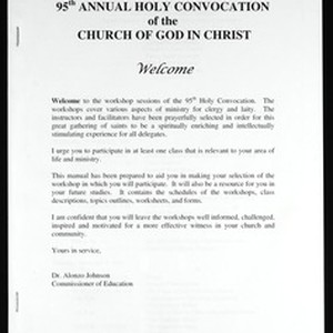 Workshop sessions program for the 95th Annual Holy Convocation of the Church of God in Christ, Cook Convention Center, Memphis, Tennessee, 2002 November 6-9. [Description English/roman)]