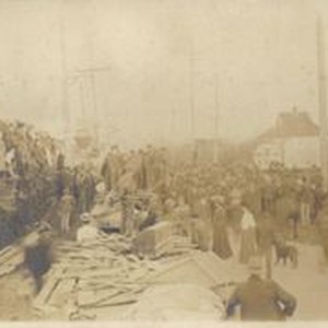 Photo--black and white: "The Battle of Sebastopol Avenue" March 1, 1905 between the electric Petaluma & Santa Rosa Railway and the steam California Northwestern (CNW) railroad right-of-way. Looking east a large crowd of men and women surround an engine of the CNW.