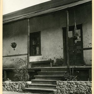 Adobe, Los Angeles, California: steps to porch and door, rock wall.