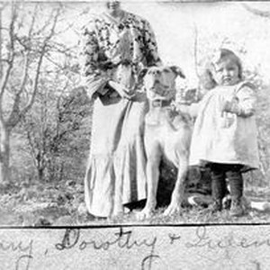 Photo--black and white: Mary (Allen) Harmon (1885-1945) with her daughter Dorothy and dog Queen, about 1906. Mary was a daughter of Otis Allen.