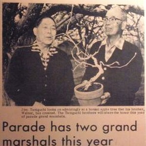 Photo--black and white, mounted: Apple Blossom parade grand marshals Jim Taniguchi, left, and his brother Walter. Walter is holding a Bonsai apple tree in this newspaper clipping. An caption is below photo.