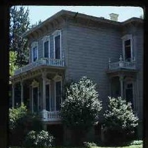 Slide transparency. Oblique view of a Victorian house with two porches and two front doors. The M. Iverson House.