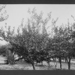 Photo--black and white, Matted: Burbank Experiment Farm orchard of plum trees.