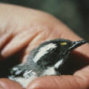 Close-up of a black-throated grey warbler held in a hand.