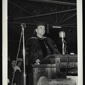 Photograph of Dr. Arenia C. Mallory speaking at graduation ceremony, [s.d.]. [Description English/roman)]