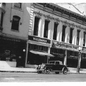 View shows several buisinesses on this block. Chris's Florist; a paint and walllpaper store (no name on sign) and Lindy's Trading Post which is a restaurant and bar supply.