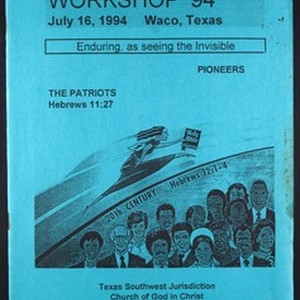 Program of the Texas Southwest Jurisdiction, Church of God in Christ (COGIC), workshop, "Enduring, as seeing the invisible", Waco, Texas, 1994 July 16. [Description English/roman)]
