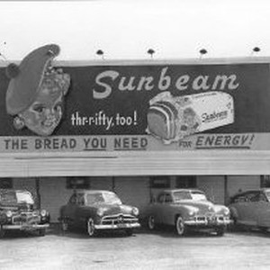 Billboard advertisement for Sunbeam Bread hangs above four 1940's vintage cars for sale.