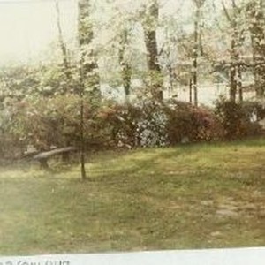 View of trees and a park bench. Written next to the photo: Dogwood at Wren's Nest in Atlanta." Photo is glued on a piece of paper. Photograph removed from file folder, National Organization of the NLAPW, 2003/051/027.
