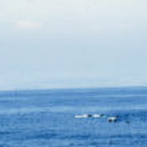 Six dolphins swimming with their fins out of the water.