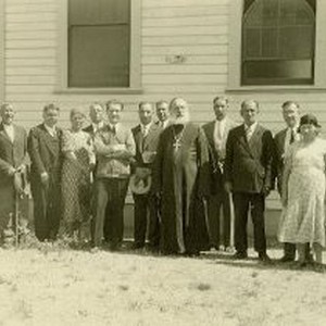 Religious procession participants pose with Russion Orthodox priest in front of their church. Possibly in Bryte.