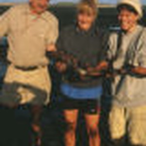 Professor Oglesby and two students proudly display a clam they dug up from the mud.