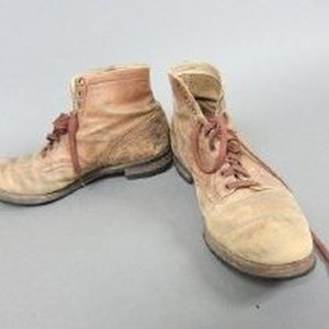 Women's tan leather ankle-high hiking boots. Half inch heel, round toe, nine metal grommets on both sides of tongue contain criss-cross lace-up closure extending from instep to ankle. Cotton laces with aglets