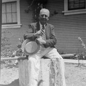 Photo--black and white, from Borba 8" x 10" celluloid negative: An unidentified man sits in a yard next to a house. He is holding a cigar and his straw hat. Circa 1930s.