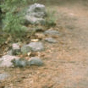 A squirrel walking on a dirt path with rocks and bushes in Frijoles Canyon.