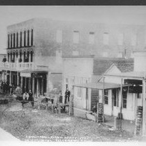Old Sacramento street scene with caption "Wells Fargo Express Office 1863 Post Office Union Hotel Sacramento, Calif."