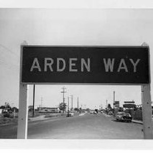 Street scene on Arden way featuring a close-up of the street sign. View shows businesses lining both sides of the street.