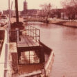 View from the waters edge includes automobiles parked along street and bridge and buildings in the background.