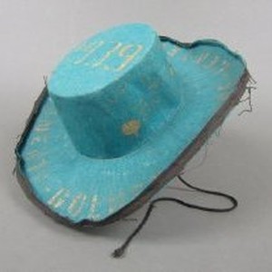 Stiff aqua blue wool felt hat from the 1939 Golden Empire Centennial of Sacramento Celebration. Wide brim is edged with torn black grosgrain ribbon. No hatband on tall flat crown. Black cotton cord chin strap. Gold stenciling on crown and brim: "1939 Sacramento Golden Empire Centennial." Green grosgrain sweatband.