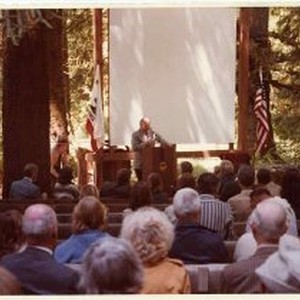 Photograph of Neasham speaking at the Dedication of the Drury Memorial Grove, 1979