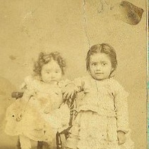 Studio portrait of two little girls. Matilda seated on high chair with Filomena standing beside her.