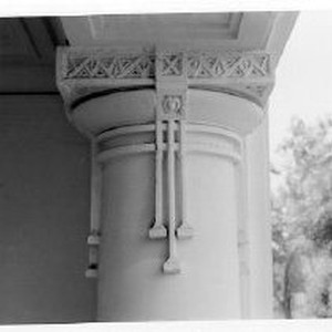 Exterior view of the front of the Merrium Apartments before demolition. This view shows the detail on the columns at the front entry.