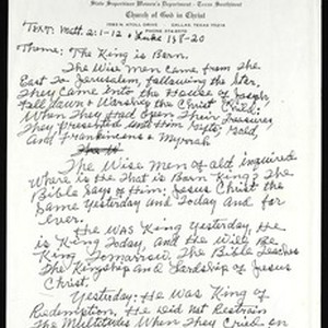 Emma F. Crouch. "The King is born", notes for a sermon or lecture (on Crouch, Church of God in Christ, Dallas, Texas letterhead), [s.d.]. [Description English/roman)]