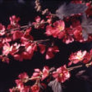 Close-up of three branches with blooming red flowers and brown leaves.