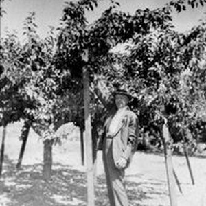 Photo--black and white, from Borba 8" x 10" celluloid negative: Alfred Hallberg standing in apple orchard next to a wooden limb support. Circa 1930s.