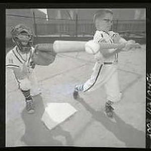 ca.1950 "Summer Fun" Baseball - Boy batter swings as catcher reaches for ball.