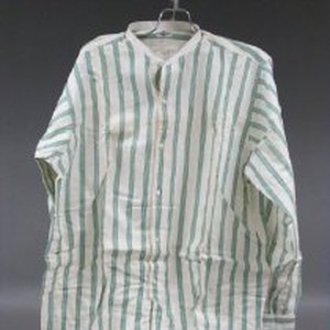 Man's white cotton shirt, with double green stripe; collarless; white shell buttons, long sleeves, French cuffs; label "Sunset"; size 16/35