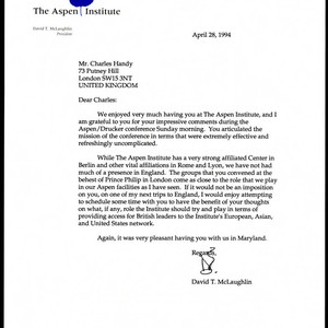 Letter from David T. McLaughlin to Charles Handy expressing thanks for Handy's comments during the Aspen/Drucker conference, and requesting an appointment with Handy, April 28, 1994; Charles Handy Papers; Box 9, Folder 18; 1 page