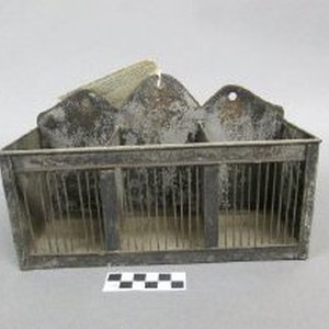 Metal letter sorter. Three compartments: "Post, Delivery, Mem." Black painted metal with bar grating on front and floral design on top.