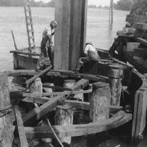 View of two construction workers building a concrete form for the pier of the Freeport Bridge.
