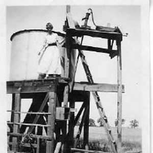 View of Daisy Florence Montfort standing on the scaffolding of a water tank. Unknown location.