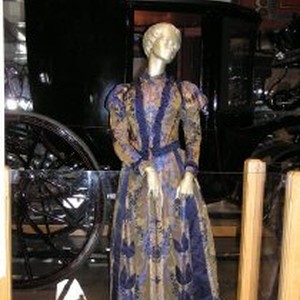 Woman's dress. Two-piece silk of blue and gray floral pattern jacquard. Bodice has stand-up collar, leg-o-mutton sleeves, front opening with hooks and eyes, trimmed in dark blue silk ruching. Skirt is of the same fabric, with alternating dark blue silk panels in front trimmed with two vertical rows of three bows of same blue silk.