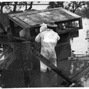A man in coveralls stands in knee-height water while rescuing rabbits from a rabbit hutch.
