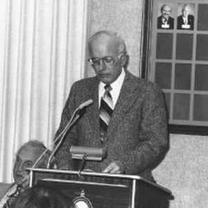 Photo of Edward Lammerding, President of Capitol Bank of Commerce. He is speaking at podium at a meeting.