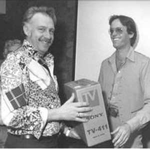 Photo--black and white: Peter Fonds presenting a TV to an unidentified man during a movie promotion circa 1960s. Stamped on back of photo: "Photo by Paul Schumach MetropolitanPhoto Service, Inc. 1501 Broadway NYC, NY 10036 TEL. 575-5905-6."