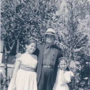 In a hat, suit and tie, Roberto Parra (center) stands between two of his daughters, Natalie (left) and Lolita (right), both wearing dresses, outisde of the family's house on Floral Drive, in the Maravilla area of East Los Angeles.