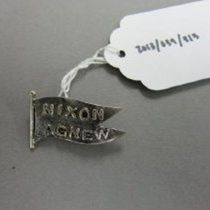 Silver-colored flag-shaped pin. "Nixon Agnew." Stamped "OSEARS" on reverse.