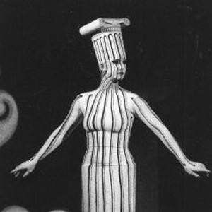 Woman stands on stage dressed as an Ionic column. This performance produced by artist, Angouxs, was part of the "Artist's Fashion Show" at the Crest Theatre to raise money for the Sacramento Aids Foundation.