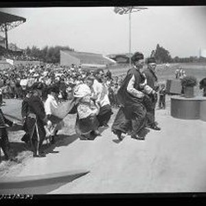 Eucharistic Congress - Fairgrounds - 4/30/50 - Men walking up stairs, crowd in background. 11 of 20