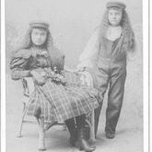 Photo--black and white, cabinet card: Rhoda L. Jonas (Jennet) (1887-1985) and her sister Alice M. Jonas (Jessie) (b 1891). Circa 1897. The sisters are daughters of Noah and Bell (Beedle) Jonas.