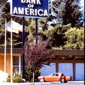Slide, Kodachrome color: Bank of America sign and corner of the Sebastopol Bank of America, located at 201 North Main Street, Sebastopol, California, September 1970