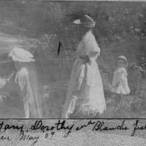 Photo--black and white: Fishing on the Russian River, L-R: Blanche Riddell, her aunt Mary Harmon and Mary's daughter Dorothy, May, 1909. Daughter and granddaughters of Otis and Harriet Allen.