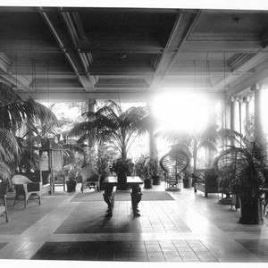 View of the loggia looking east from the residence end. Numerous chairs and potted palms line the side, with another palm on a table in the center.