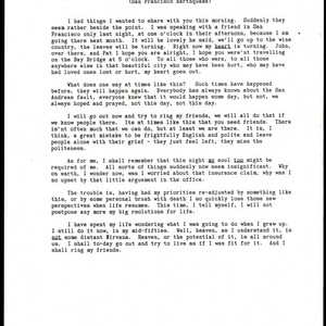 Thought for the day by Charles Handy on the San Francisco earthquake of 1989 and reestablishing proper priorities in life, October 18, 1989; Charles Handy Papers; Box 18, Folder 5; 1 page